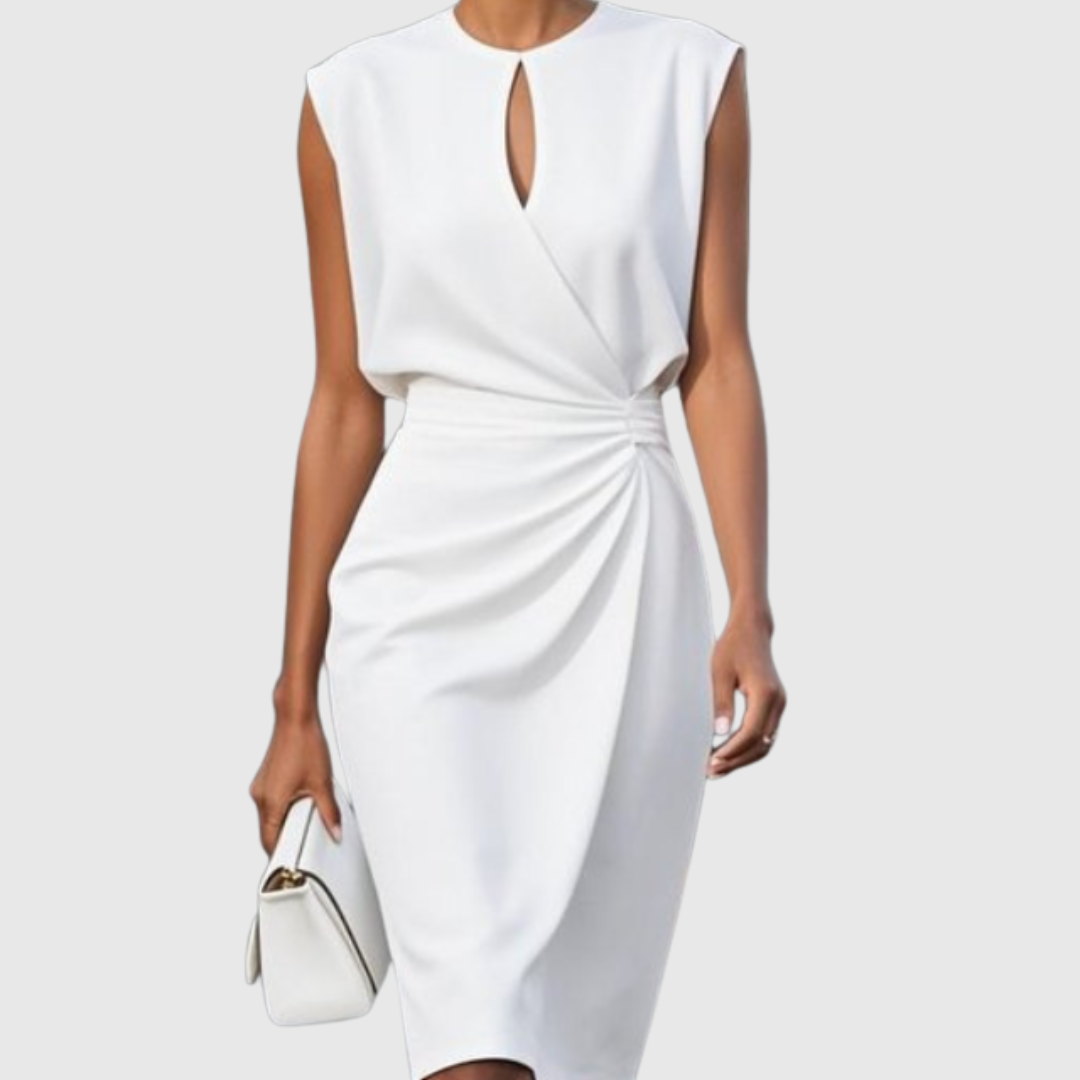 Elevate every day with Geovari’s sleeveless dress, crafted with a smooth, breathable drape and refined side gathering to sculpt a sleek, flattering silhouette. A subtle keyhole neckline adds a modern finish, making it a versatile piece that moves effortlessly from desk to dinner throughout spring to autumn.